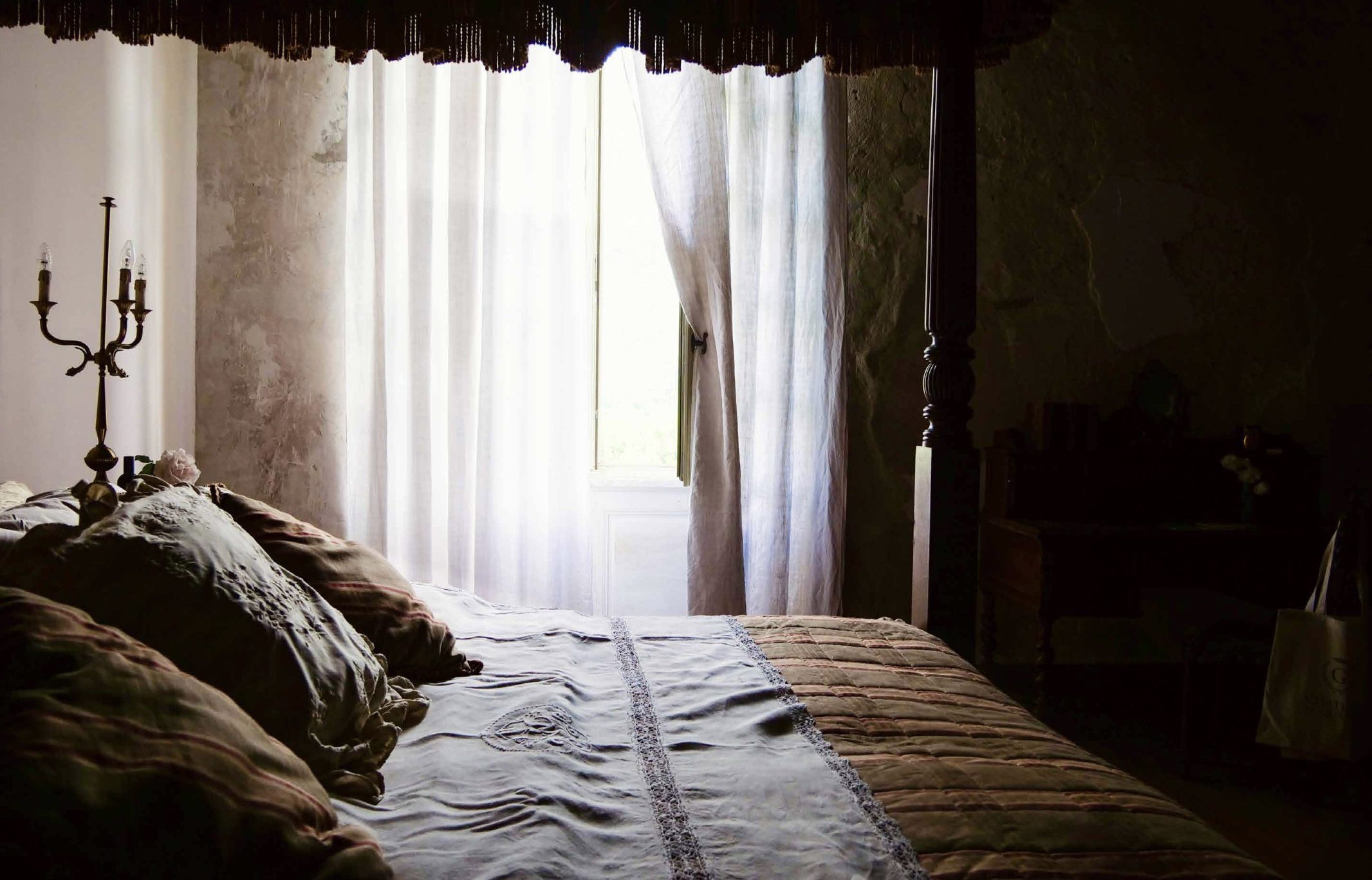 Finally, we began furnishing the room. Foremost in our mind was that we knew that there had to be thread between the later 18th and 19th Century style bedrooms and the more Renaissance style quarters. And so, we chose a mélange of French furniture from different eras. Adding just enough furnishings to be cosy, and fill the room with texture, whilst keeping the focus on the beauty of the ceilings and the view of the mountains from the window.